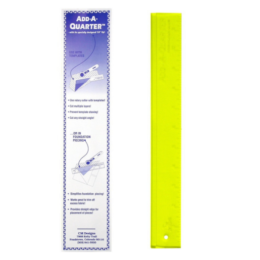 The Add-A-Quarter combines the speed of rotary cutting quilt pieces with the accuracy of using templates. Once your templates are made, the Add-A-Quarter will automatically add the customary 1/4" seam allowance to any straight angle and provide a straight edge for your rotary cutter.