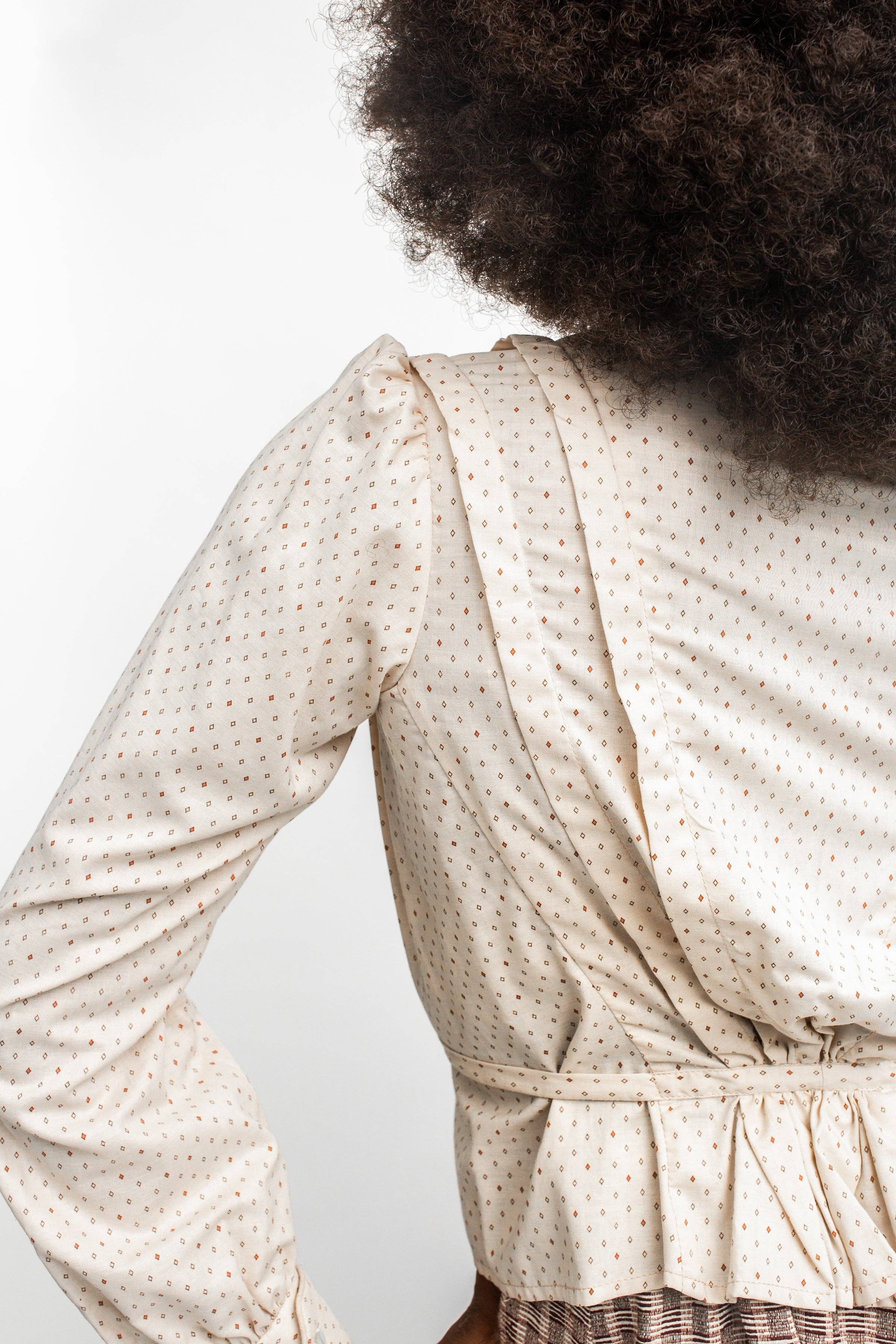 A pretty scalloped front opening and gathers at the back waist soften the silhouette (a simpler straight front placket is optional). Moderately full set-in sleeves gather neatly into buttoned cuffs.