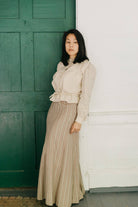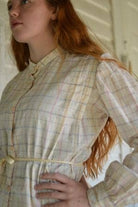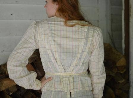 The skirt features bias trim detailing at the hem, which also trims the cuffs and front opening of the blouse. The elegant princess line in the back of the Shirtwaist is accented by two wide tucks that extend over the shoulders to the front.