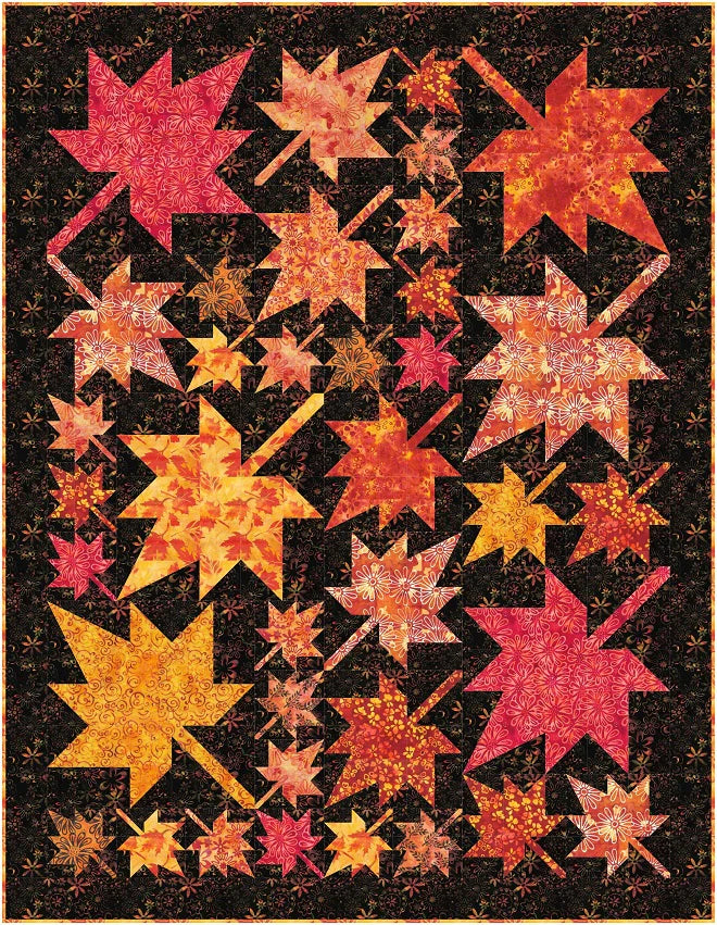 A throw quilt with multiple block sizes to make a striking fall leaf quilt.