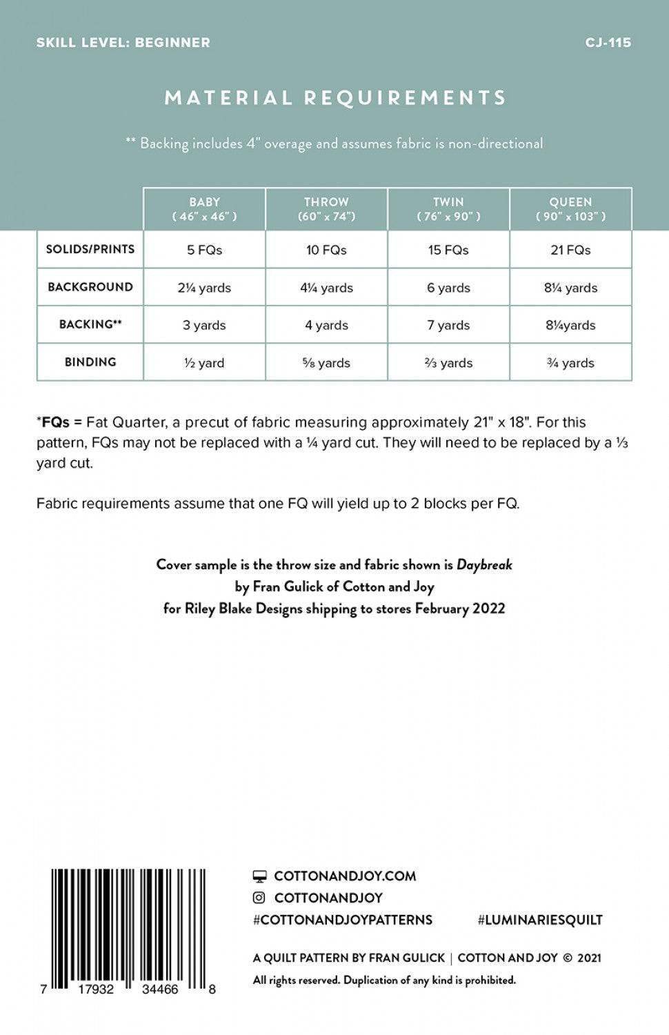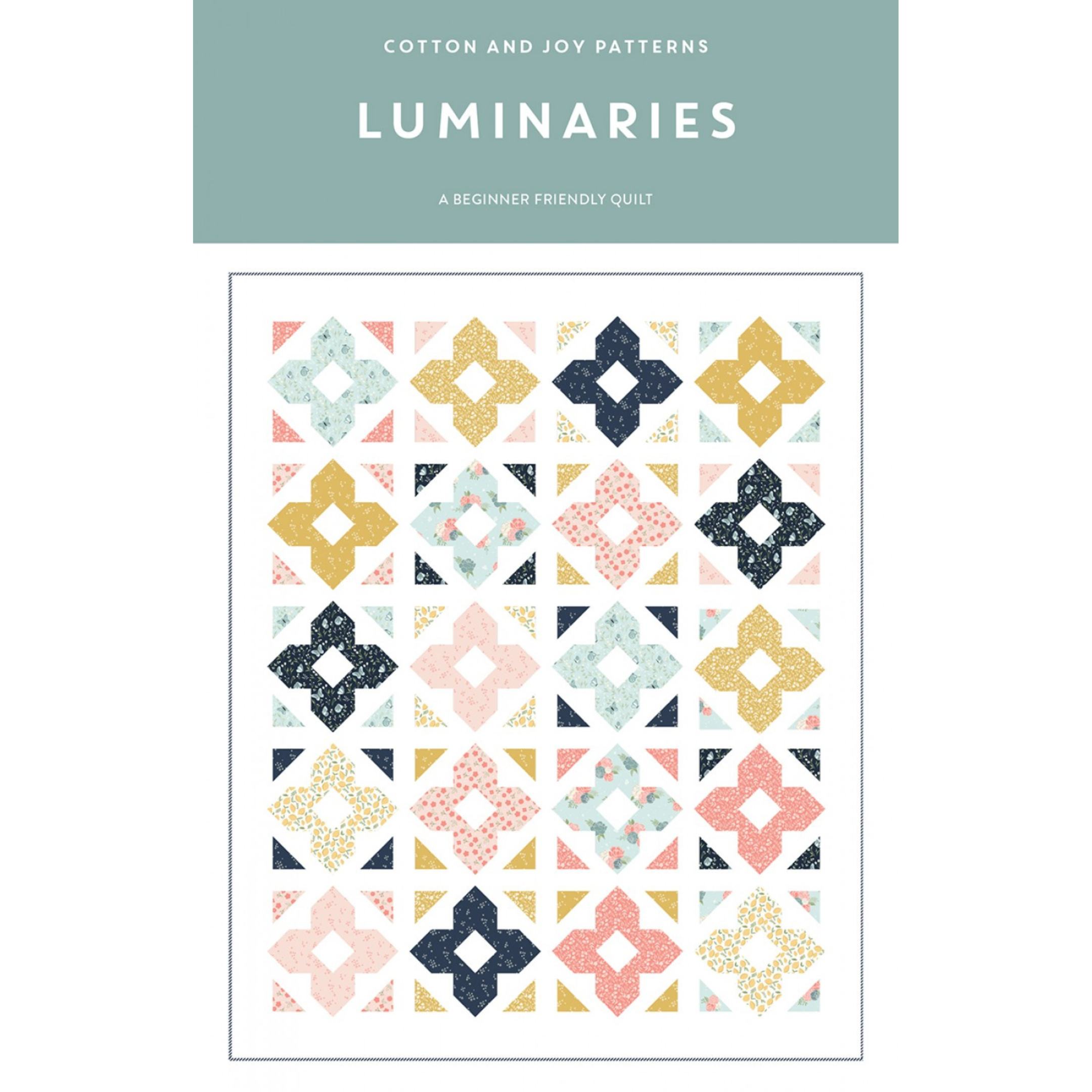 The Luminaries quilt pattern is a fun mix-and-match pattern, perfect for beginners. This block-based pattern is fat quarter friendly and the perfect pattern to try whether your tastes are traditional, modern, or somewhere in between. Pattern includes multiple sizes: baby, throw, twin, and queen.