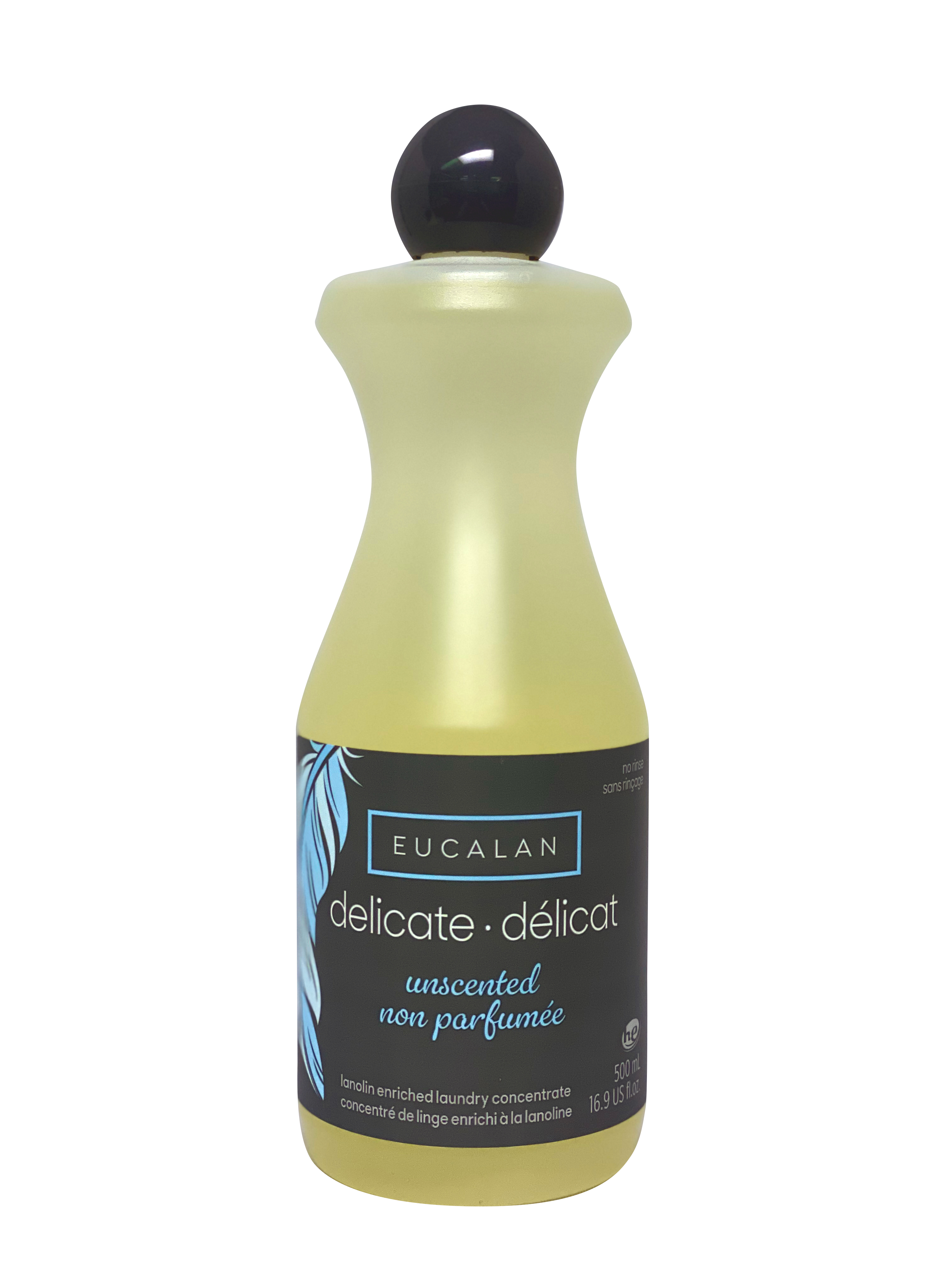 Eucalan No Rinse Delicate Wash is non-toxic, biodegradable, free of optical brighteners, phosphates, synthetic fragrance and dye. Eucalan is pH neutral and is packaged in an easy to recycle, dye free HDPE plastic bottle. Available in 5 scents, Eucalan is scented with only quality essential oils, in addition to natural/unscented. The lanolin acts as a natural conditioner, keeping fibres supple and reducing static. Eucalan meets strict European regulations, it is "quickly" biodegradable.