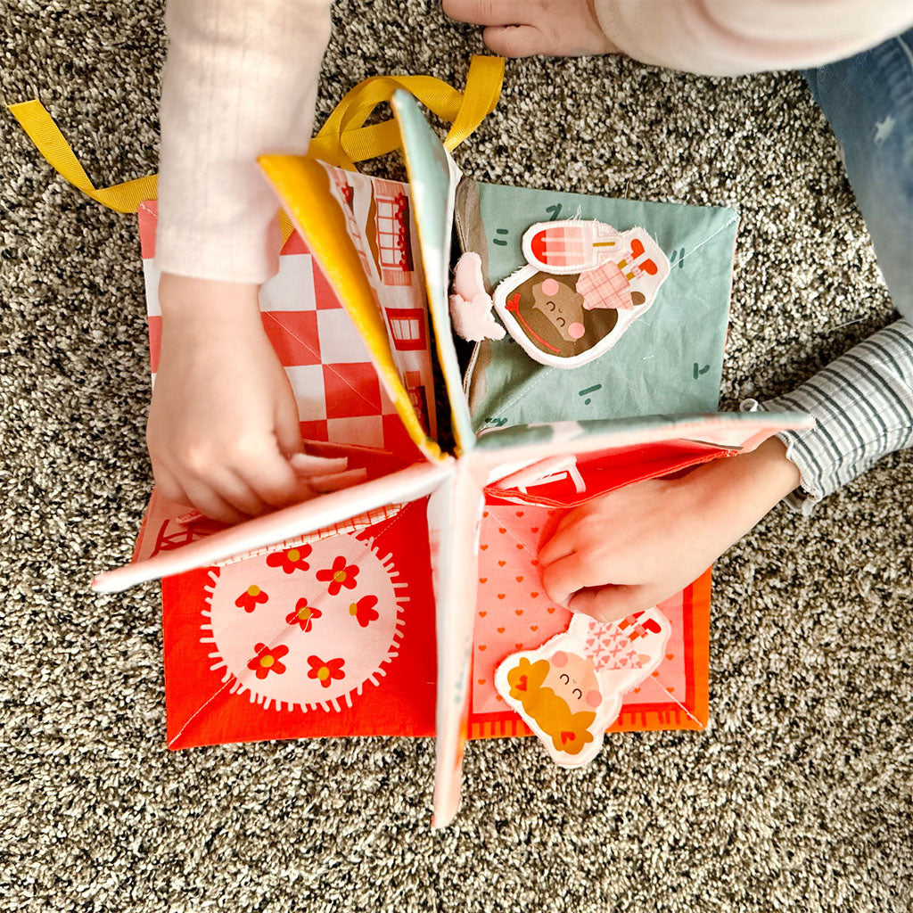 Book instructions printed on panel fabric. Once complete, book ties open into a four-room dollhouse with pockets to store the felt-backed pieces, and ties shut for easy on-the-go play.