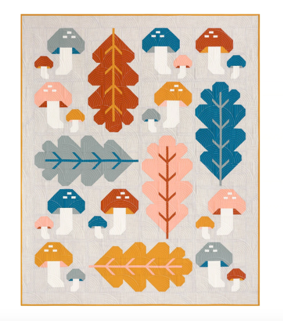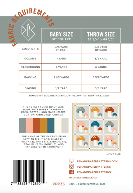 Forest Fungi is a woodland inspired, traditionally pieced quilt that can be made in two sizes: Baby (51" square) and Throw (56 3/4" x 69 1/2"). The pattern includes bonus instructions for making an 18" square zippered pillow using the Mushroom block as well! Additional pattern features are optional foundation paper piecing (FPP) patterns for the Mushroom block, downloadable coloring pages, tags for organizing your cuts of fabric, and 26 pages of detailed instructions & diagrams!