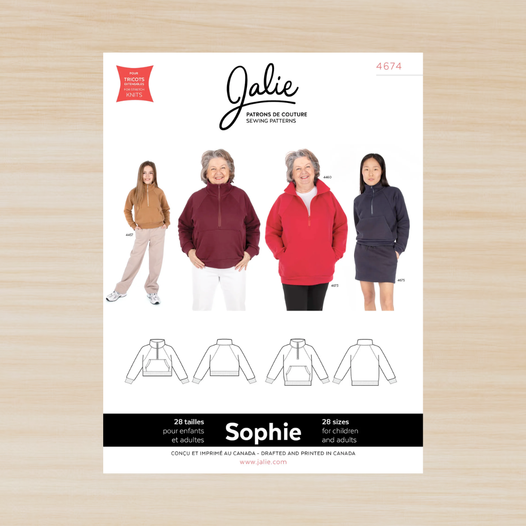 Medium-weight stable knit with approximately 20% stretch in the width, some stretch in the length and a nice drape (not too stiff) like double knit or French terry. Avoid fabrics that are stiff, heavy or very stretchy (max. 40% stretch).Jalie 4674 - Sophie Half Zip Sweatshirt 2yrs-2XL