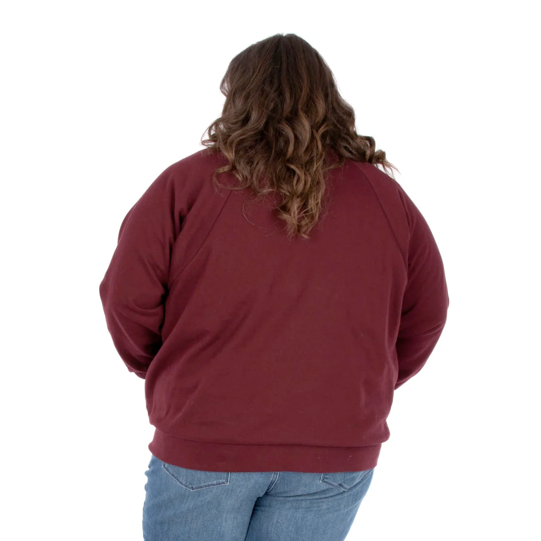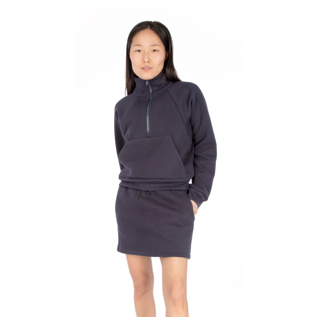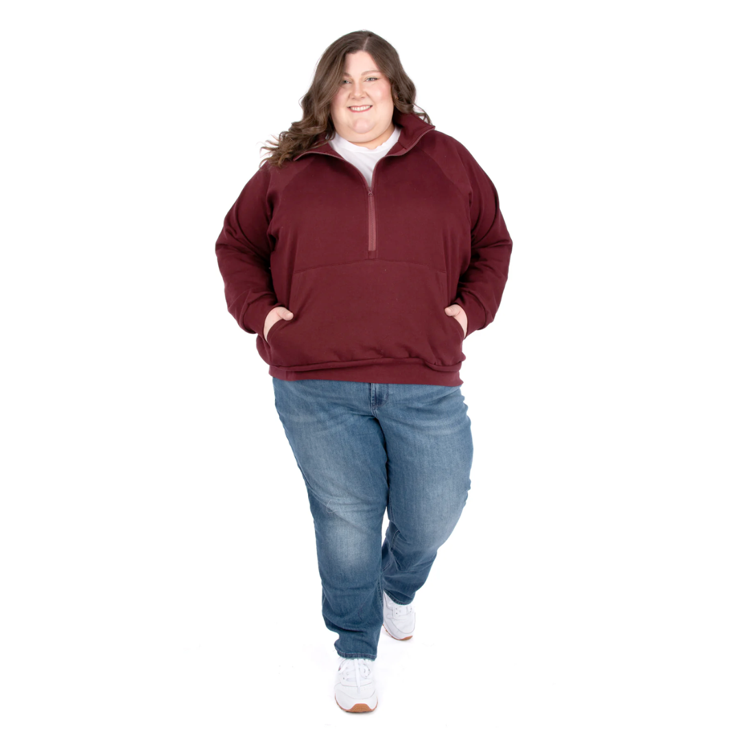 Sewing pattern for a relaxed-fit half-zip sweatshirt with a cozy high neck and roomy kangaroo pocket. Choose between a cropped or hip-length version for two different looks.