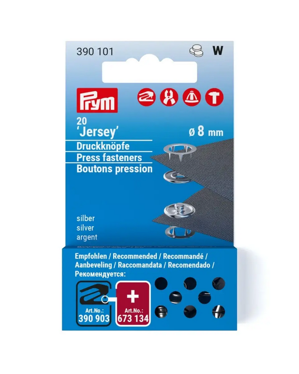 Prym Jersey press fasteners provide light to mid-strength closure and are specially designed for thinner and stretchy fabrics – like the ones used for baby and children’s clothing. With these press fasteners, there is no need to pre-punch a hole before attaching them. Instead, the integrated self-locking ring presses into the fabric, protecting it. Wash them, tumble dry them, dry clean them, iron them, press them: Prym's rustproof Jersey press fasteners are up to the task. The pushers are available in different colours, sizes and designs: with a serrated ring, smooth cap or pearl cap. The tools for processing are also varied. The VARIO Creative Tool and the matching Jersey press fastener tool set (673 134) are particularly easy to use for attaching Jersey press fasteners with Ø 8 mm and 10 mm. Depending on the size, other options include VARIO pliers, tripod, hammer or the tools supplied in the combi packs. Icons on the packaging show the appropriate tools.