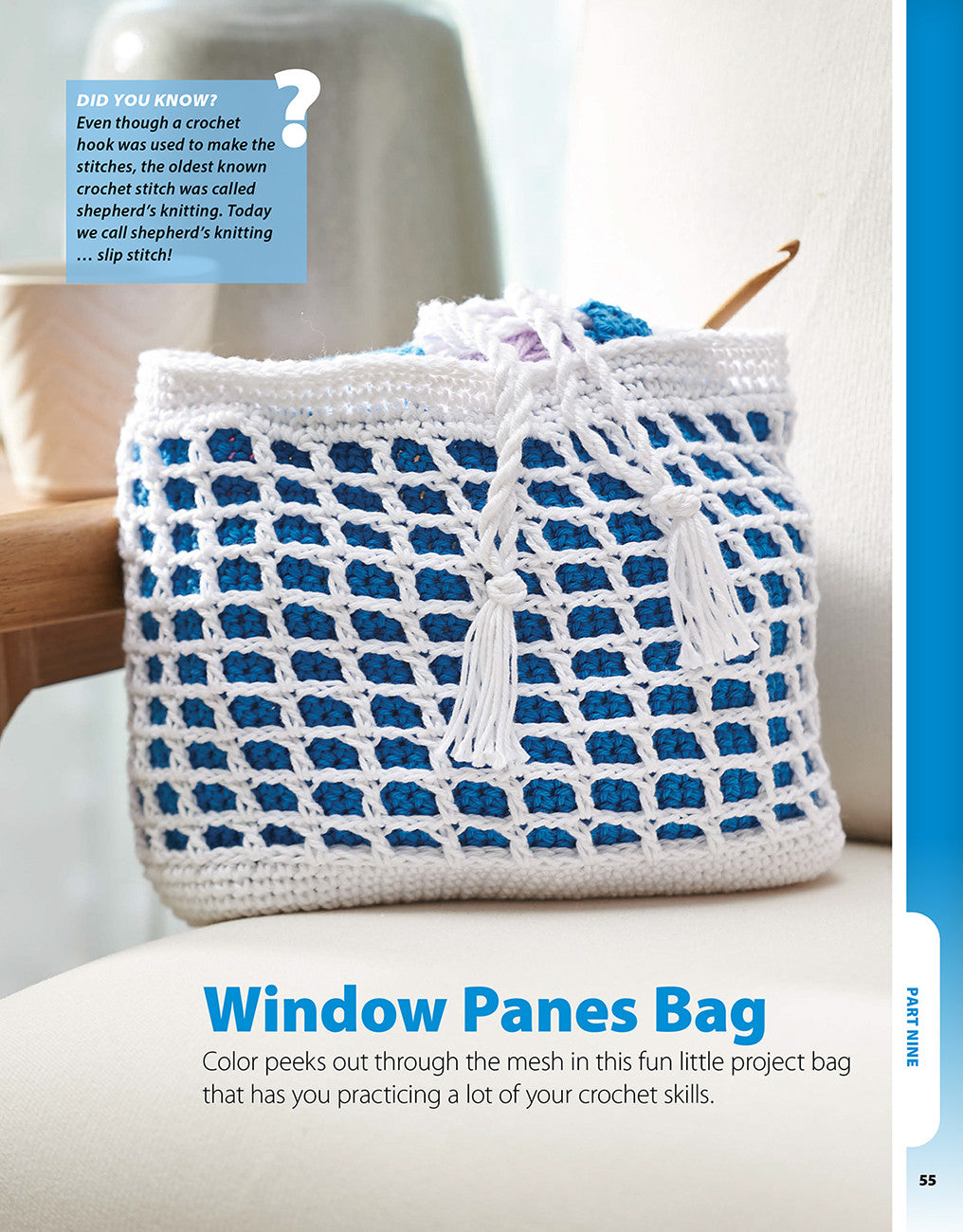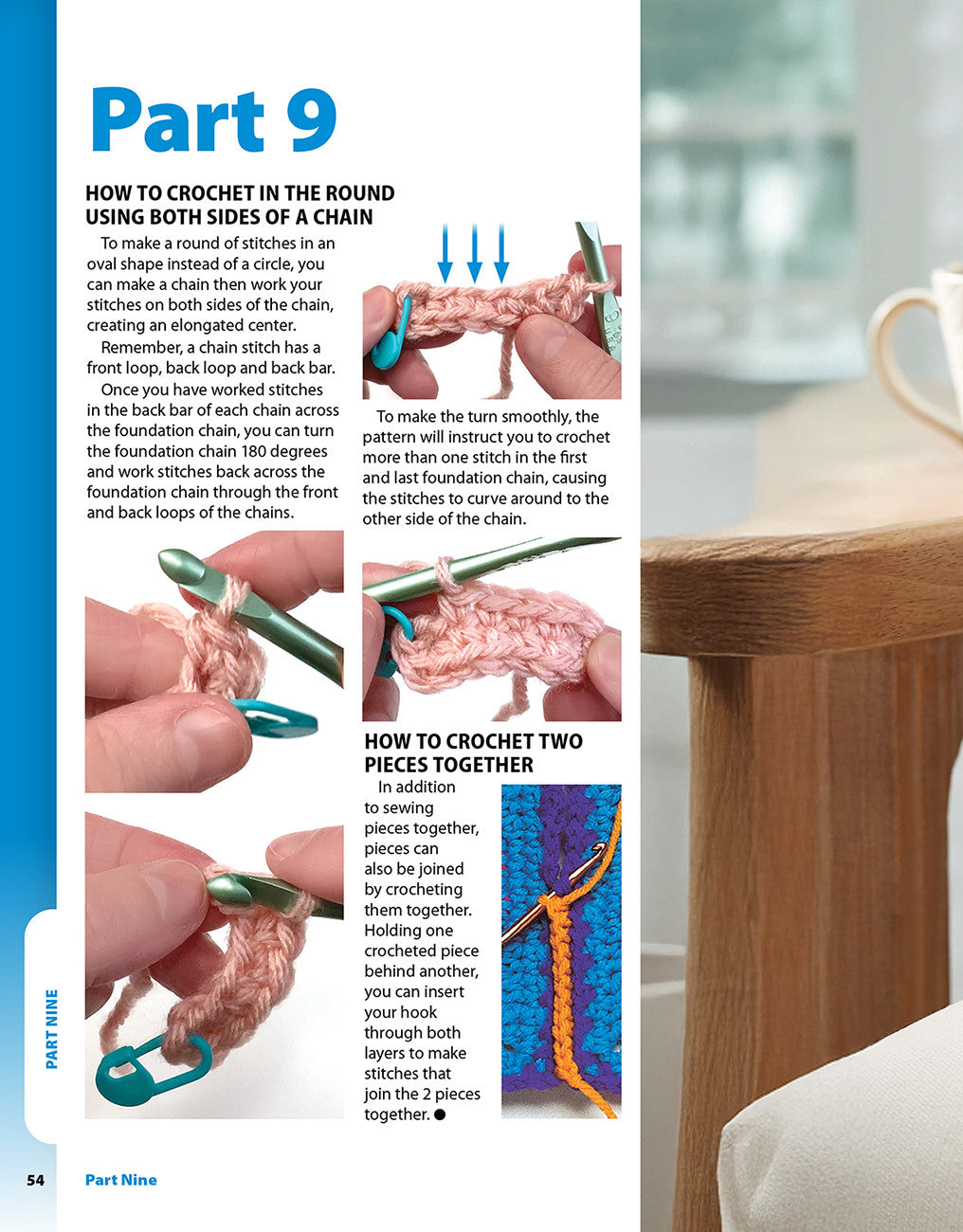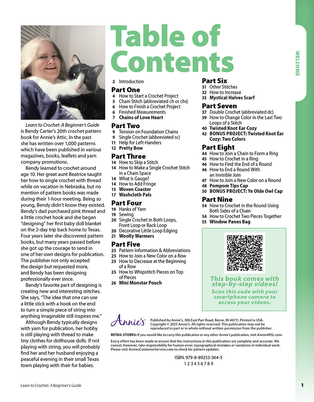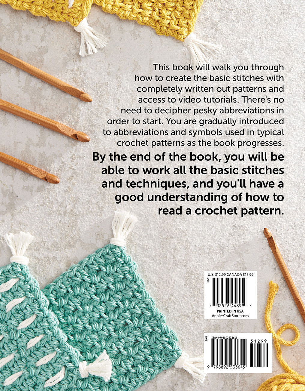 Readers will learn the basics of crochet while creating 13 beautiful projects. Also included are 10 bonus ideas for unique adaptations of the designs. The book is divided into parts that gradually introduce new basic stitches and skills. Patterns are written out—none exclusively use abbreviations that would confuse the learner, but abbreviations are introduced alongside spelled-out terms in the later patterns so the beginner can see how crochet patterns are typically written. All projects use a size 5mm hook and worsted-weight yarn.