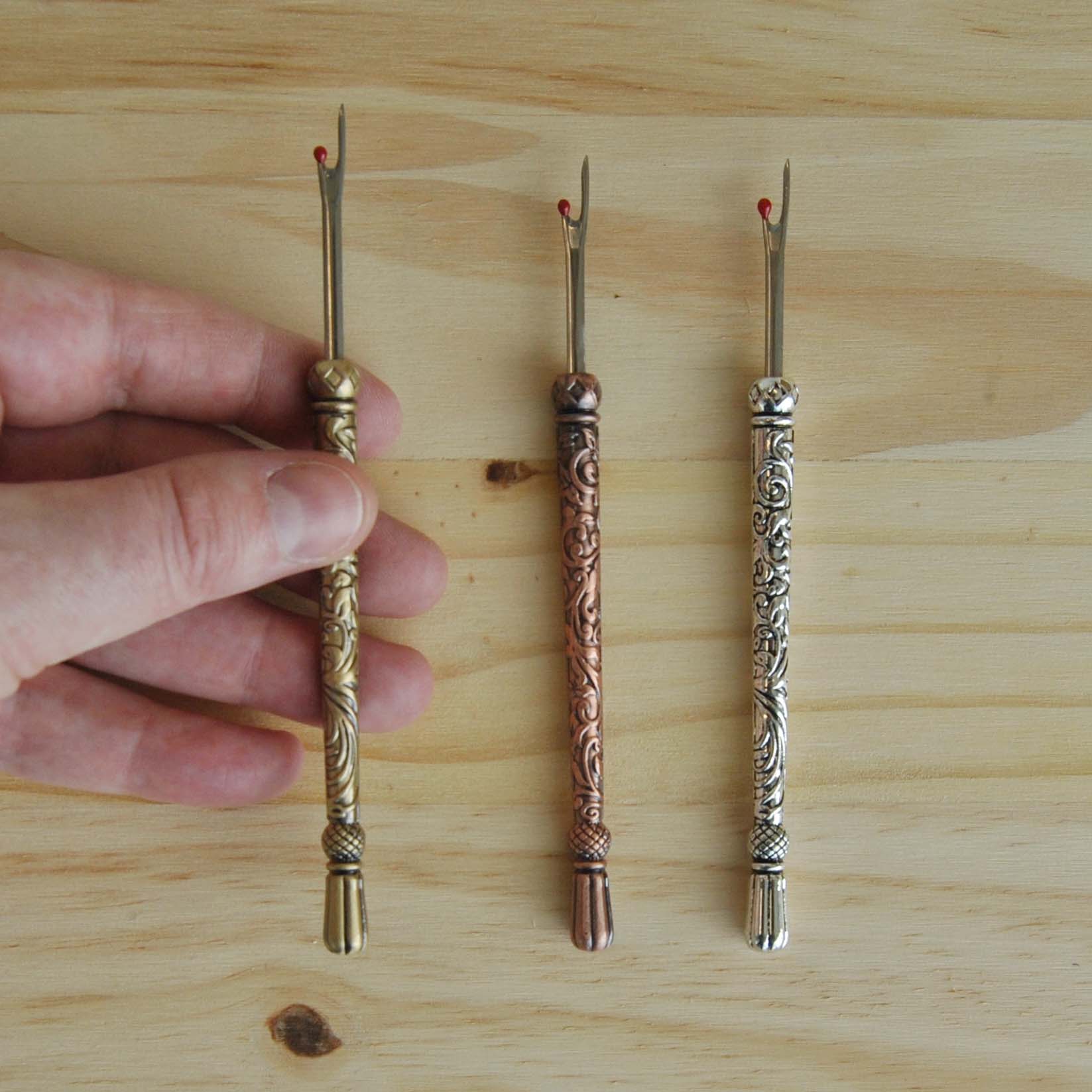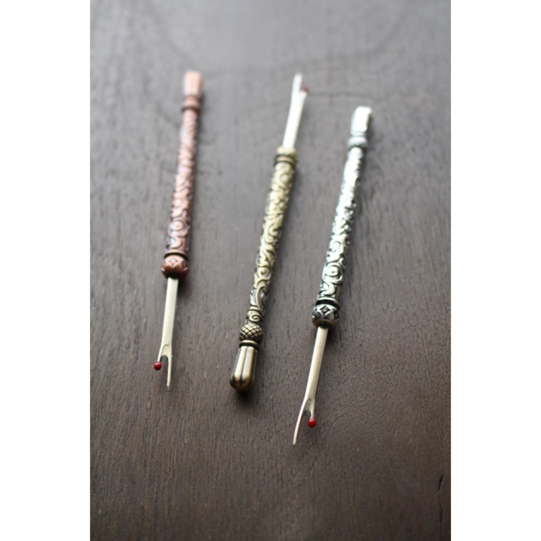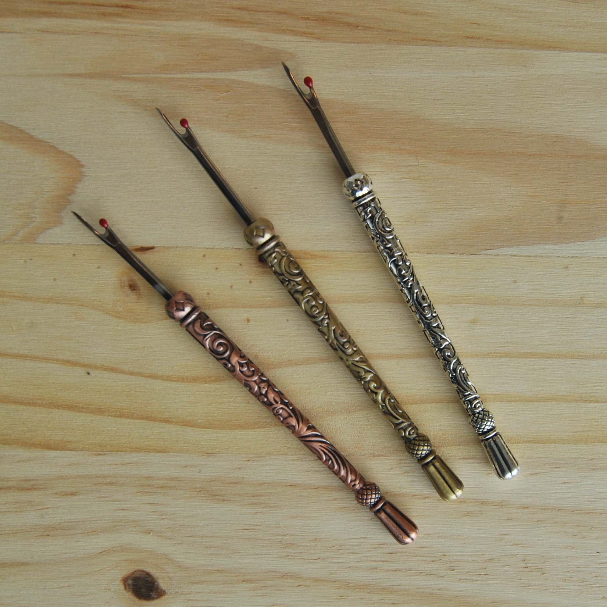 Use this beautiful seam ripper to easily rip out unwanted seams, threads and buttonholes. Includes a plastic safety cap and a small ball on the point to prevent fabric damage. The vintage-style metal engraved handle makes this a unique gift! Available in your choice of antique gold, antique copper and antique silver that match our embroidery scissors.