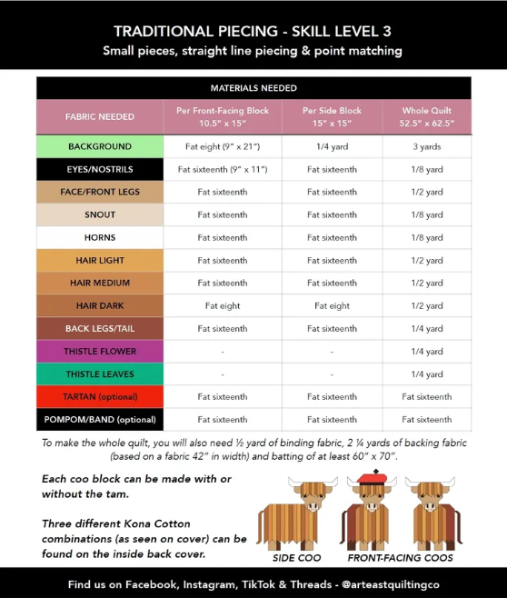 Mini Coos - a Highland Cow Quilt Pattern Skill level 3/3 - confident piecer Introducing a new and fresh take on our famous Cattle Call Quilt Pattern! This fun quilt is 52.5" x 62.5" and features adorable highland coos in a mini format. It also includes optional Scottish tams (hats) to accessorize your coos. The quilt includes two types of coo blocks: the front-facing coos looking in two directions (10.5" x 15" finished) and the side coo (15" x 15" finished). You can make each coo with or without the Scottish tam. Additionally, the pattern includes two different thistle blocks to create the borders. The coo blocks are versatile and can be used in other projects, such as tote bags, runners, jackets, and more! We designed this quilt using traditional piecing techniques, so no paper piecing is involved. The quilt requires precision piecing, with small pieces, straight-line sewing, and some points to match. The pattern comes in full colour and is saddle-stitched with a soft laminate cover, spanning 34 pages. This quilt is too cute not to make, so get MOOOOOving!