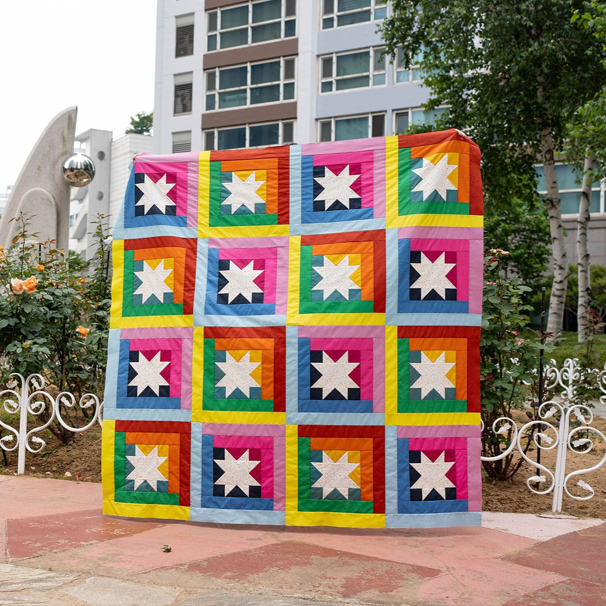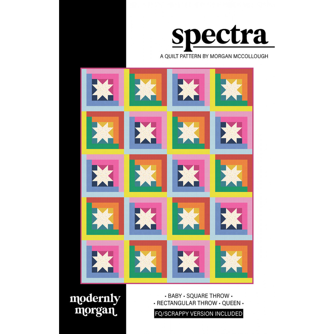 Spectra is the happy merging of beautiful colors, traditional piecing and whimsy!  Create a prismatic rainbow inspired quilt or come up with your own combination of prints and colors.  The sky is the limit!  Pattern includes 2 options:  Yardage and Scrappy/FQ versions.