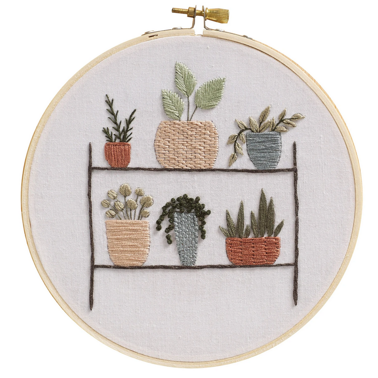 Leisure Arts Embroidery Kit 6" Plant Shelf- Printed embroidery design features a 2 tier shelf with 6 different potted plants.