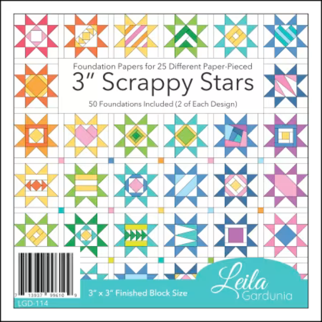 Bust through your smallest scraps with 3” foundation paper-pieced Scrappy Stars. This foundation pad makes it easy to choose a foundation and start sewing. No fussing with printers! The foundations are pre-printed on lightweight paper making them easy to see through and remove. Use your Scrappy Star blocks in wall hangings, bags, apparel, zipper pouches and more!