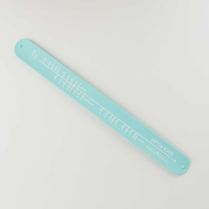 • Place the ruler with the arrow snug into the heel (or toe) of your sock and knit until you reach the line for your desired size