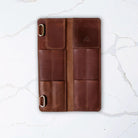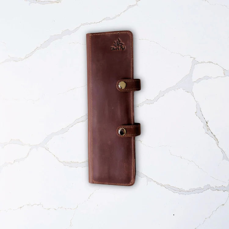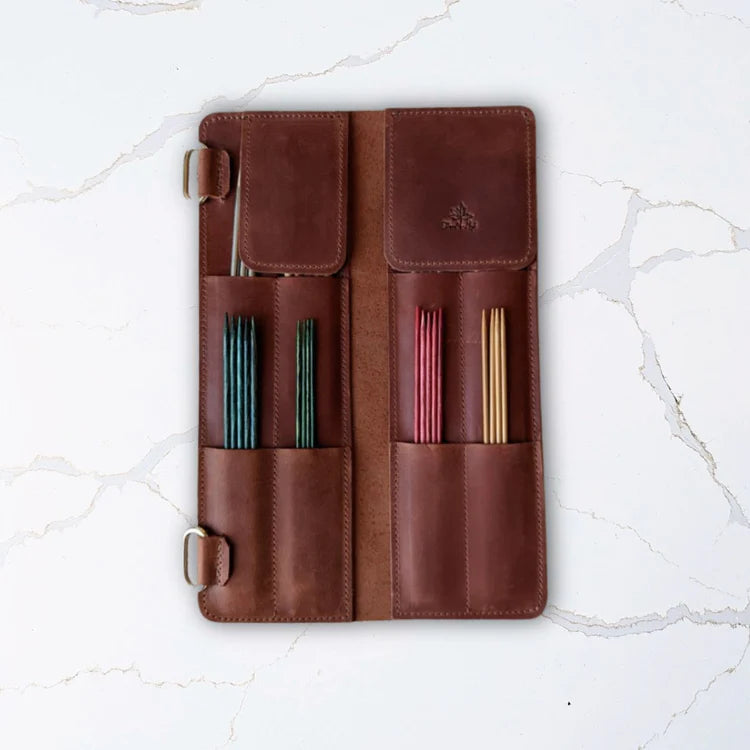 This handmade leather case is ideal for storing your double-pointed needle sets, but can also be used for crochet hooks and specialty needles. It is fitted with 8 distinct compartments, each able to house up to 4x US8/5mm or 5x US4/3.5mm DPN needles.