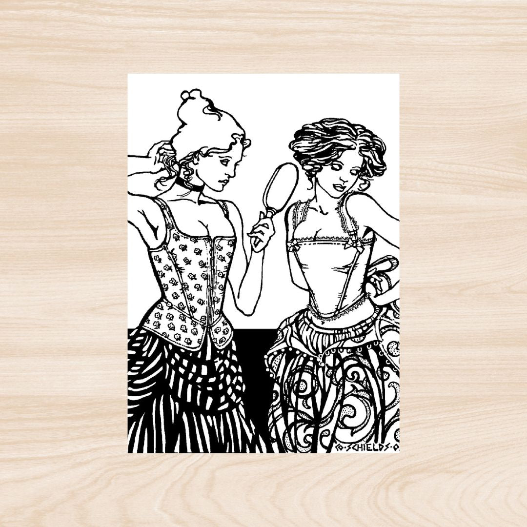 The idealized figure silhouette of the Elizabethan era (1558-1603) required stiffened supporting undergarments to maintain a slender and visually elongated upper body. Both men and women wore such undergarments, so the early corset-makers were also men's tailors and armor-makers. M' Lady's Corset is representative of the late 16th and early 17th-century garments worn by upper-class women in the royal courts (square-neck version) and working class women in their daily lives (scoop-neck version). Both versions feature dropped waistline at center front to the V-neck that was characteristic of the Elizabethan era, and wide-set shoulder straps to further emphasize the small-waisted impression.