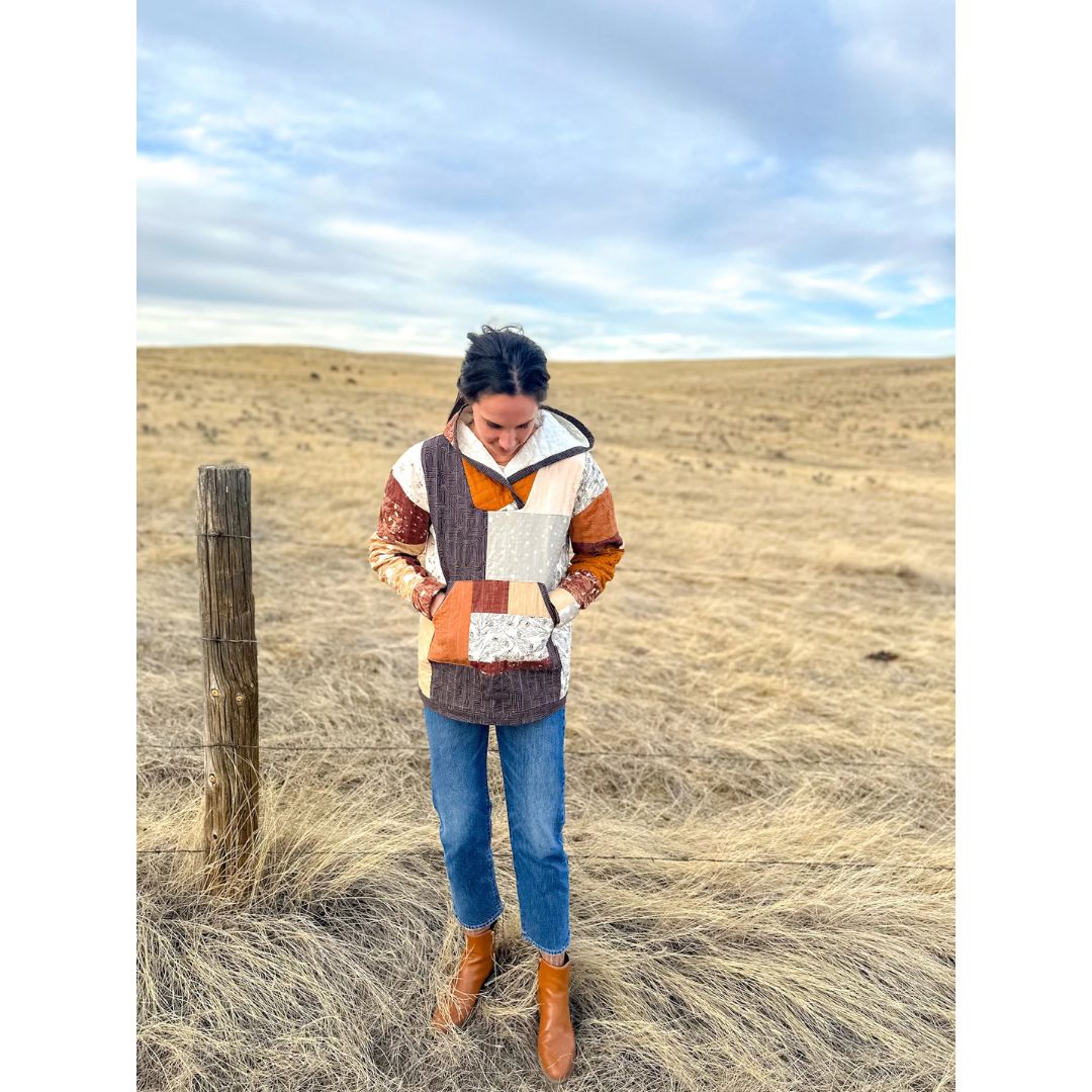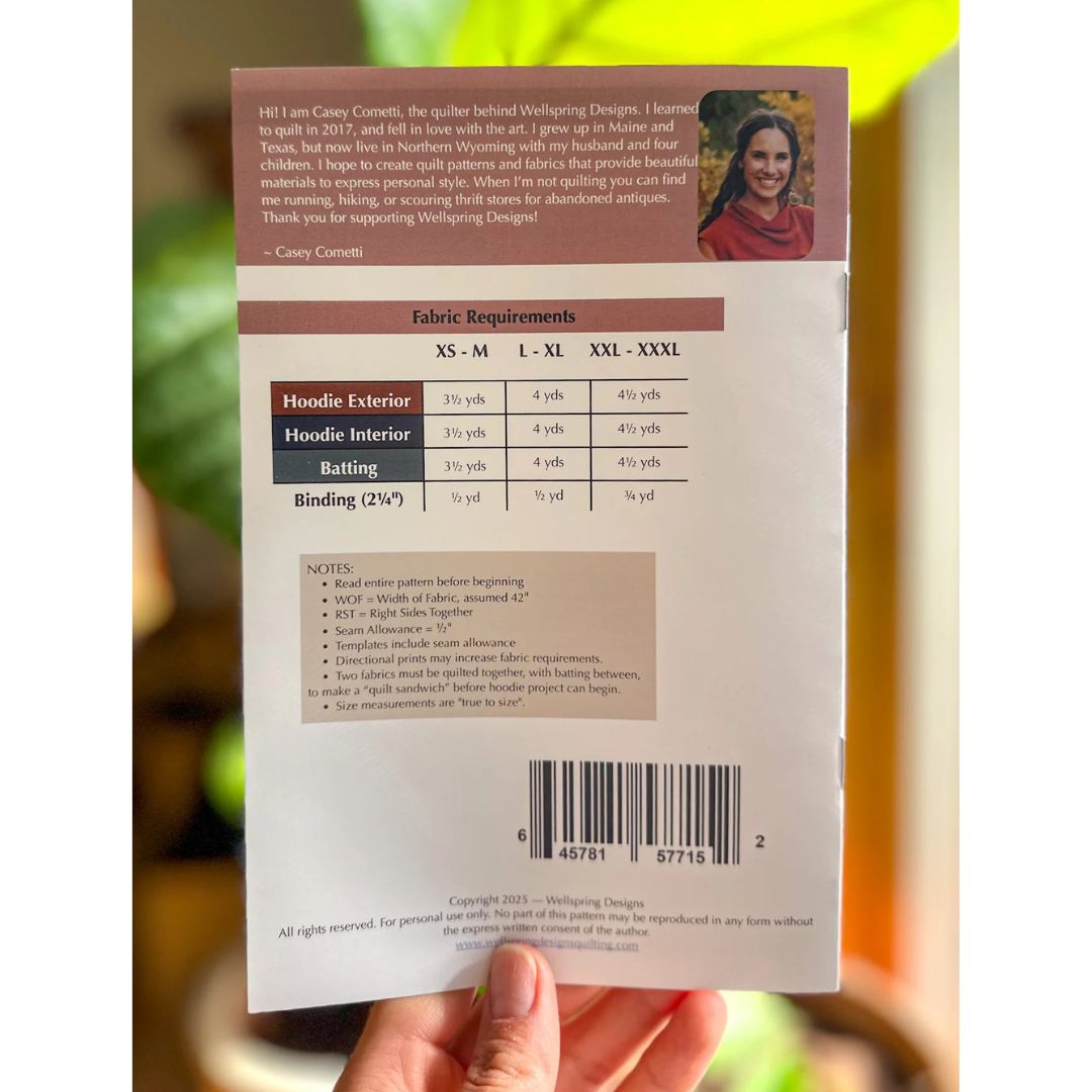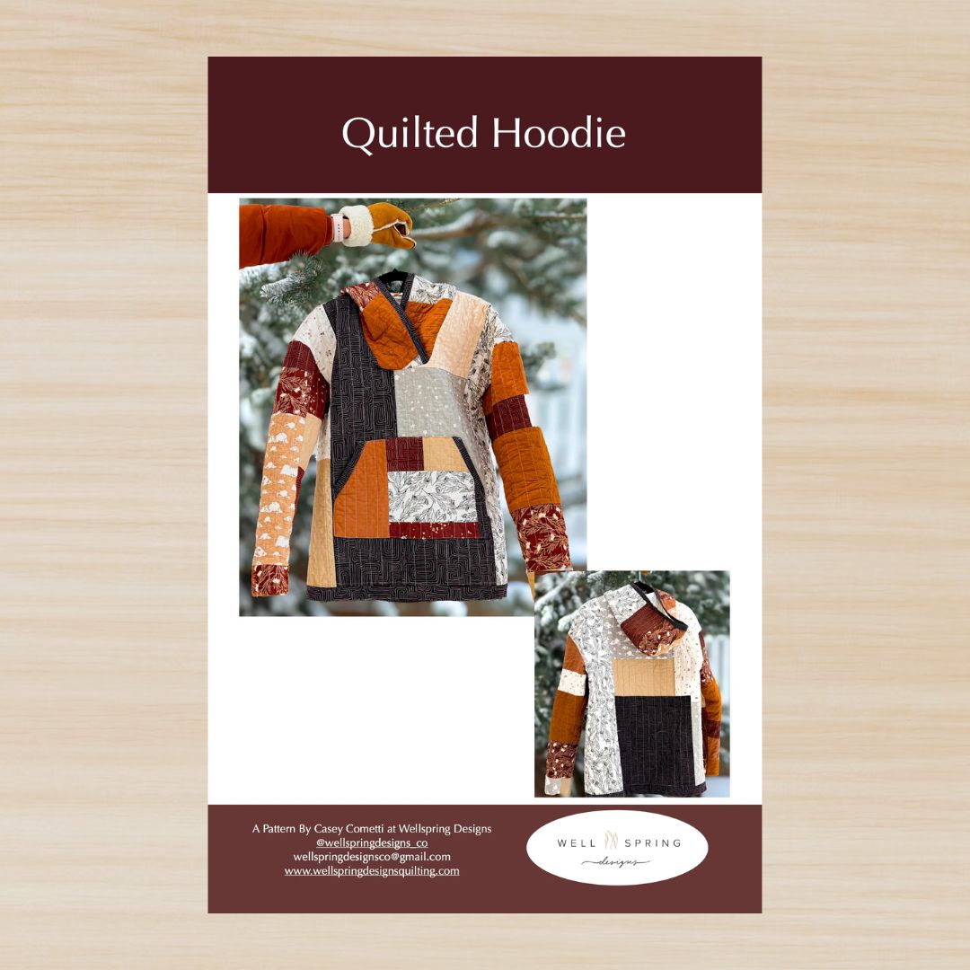The Dancing Daisies Quilted Hoodie by Casey Cometti of Wellspring Designs makes your quilt wearable in cool weather and is perfect for using scraps or your favorite print. Requires between (2) 3.5-4.5 yard cuts or pieced sections (depending on sizing) for outside and lining. You will also need batting and binding. Includes sizes XS- XXL.