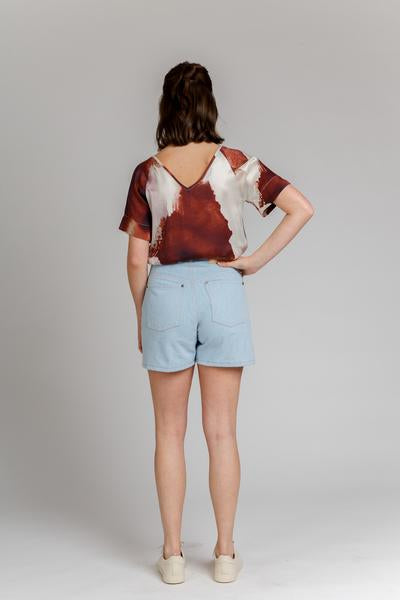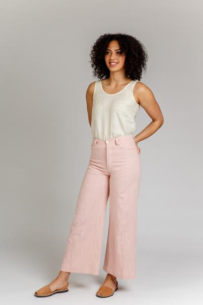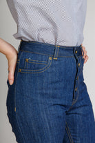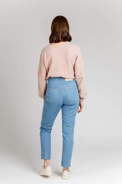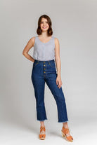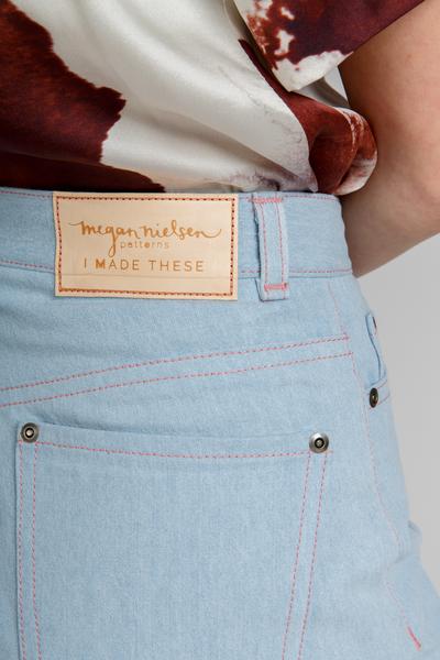 Classic high waisted rigid jean pattern set. Includes four cuts and multiple lengths for tall, regular and cropped. Pattern features a high rise to sit on the natural waist, button fly, close fit through the waist and hips and classic jeans details. Inspired by Megan Nielsen's hunt to find the perfect pair of vintage jeans this pattern will fulfil all of your vintage jean dreams!