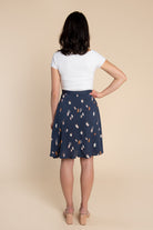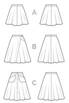 Available in above or below the knee lengths, the Fiore Skirt has three views. View A is a simple flared skirt with an invisible zipper at the back. View B is an asymmetrical wrap skirt with single hip pocket. View C buttons up the front with curved patch pockets.