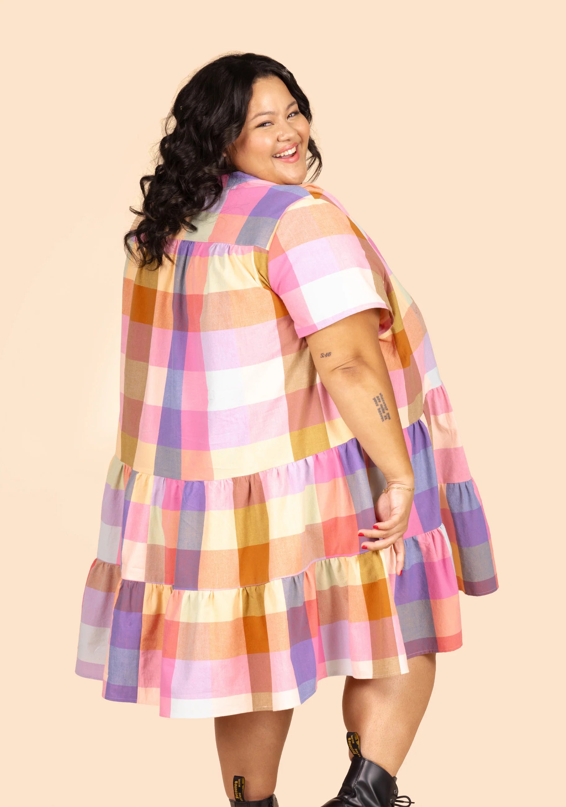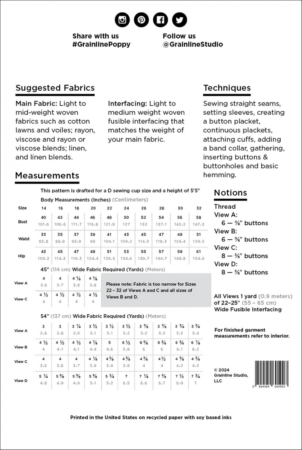 The Poppy Dress is a versatile and playful dress, fitted at the shoulders and relaxed through the body thanks to tiered gathers in two lengths. Make Poppy your own with your choice of short sleeves or long sleeves gently gathered into cuffs. Use flannel for a cozy winter dress, make a breezy picnic dress in cotton lawn, or choose a glittery lamé for a special party look. Techniques involved include sewing straight seams, setting sleeves, creating a button placket, continuous plackets, attaching cuffs, adding a band collar, gathering, inserting buttons & buttonholes and basic hemming.
