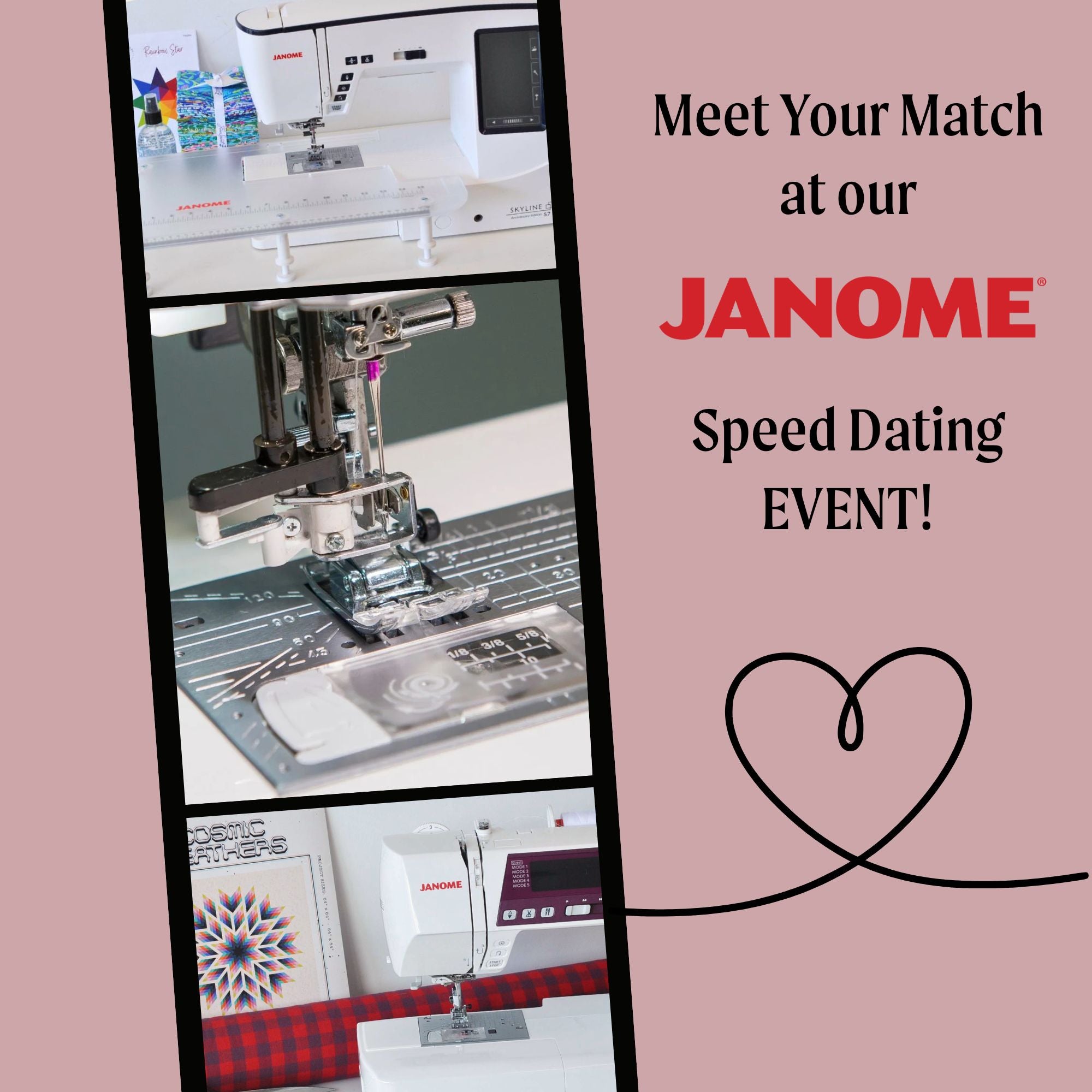 Ready to find your perfect sewing machine match? 💕 “Speed-date” 5 of our most popular Janome sewing machines! For a $15 fee, you’ll get 10 minutes of hands-on time with five different Janome machines each, rotating through quick “test drives” so you can compare features, feel the difference, and see which machine fits your sewing style best. Low-pressure, fun, and a great way to try before you buy. If you purchase a sewing machine during this event, the event fee will be put towards the purchase of the machine.