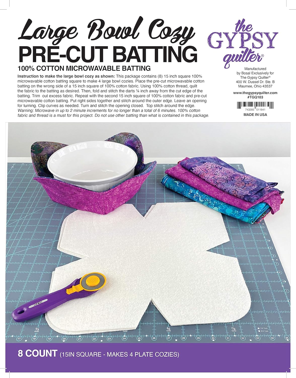 With this project you MUST use 100% cotton thread and 100% cotton fabrics ONLY. 100% cotton pre-cut batting to make a microwave large bowl cozy. This pack makes 4 large bowl cozies