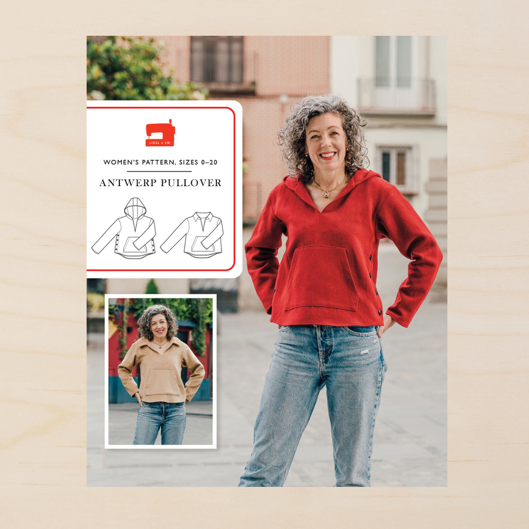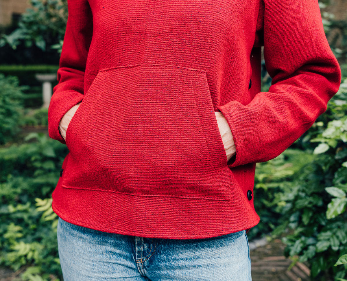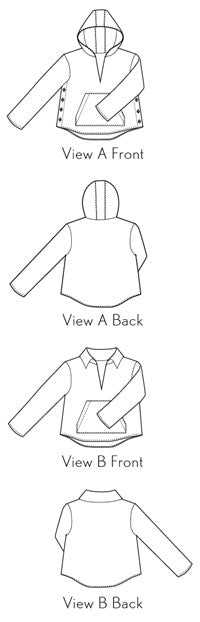 A dressy twist on the classic hoodie, this pullover is full of style. Sew it from heavier woven or stable knit fabrics. Both views include a slightly cropped and boxy shape with V neck, front kangaroo pocket, and a curved longer back hem for more coverage. Choose View A with button or snap plackets at the side seams and a lined three-piece hood, or View B with sewn side seams (no buttons) and a classic one-piece collar.