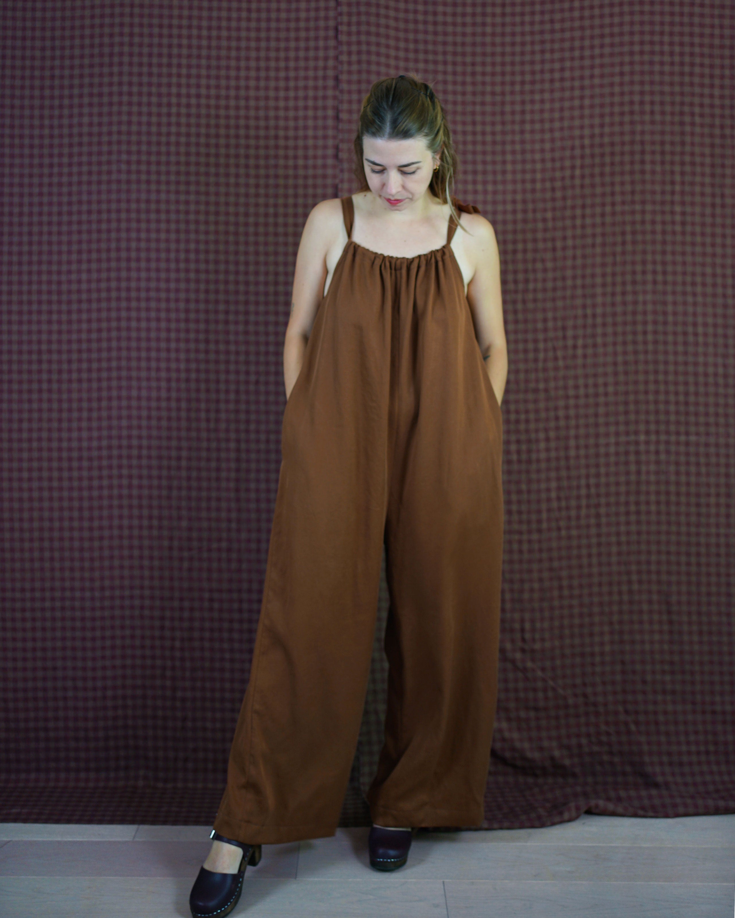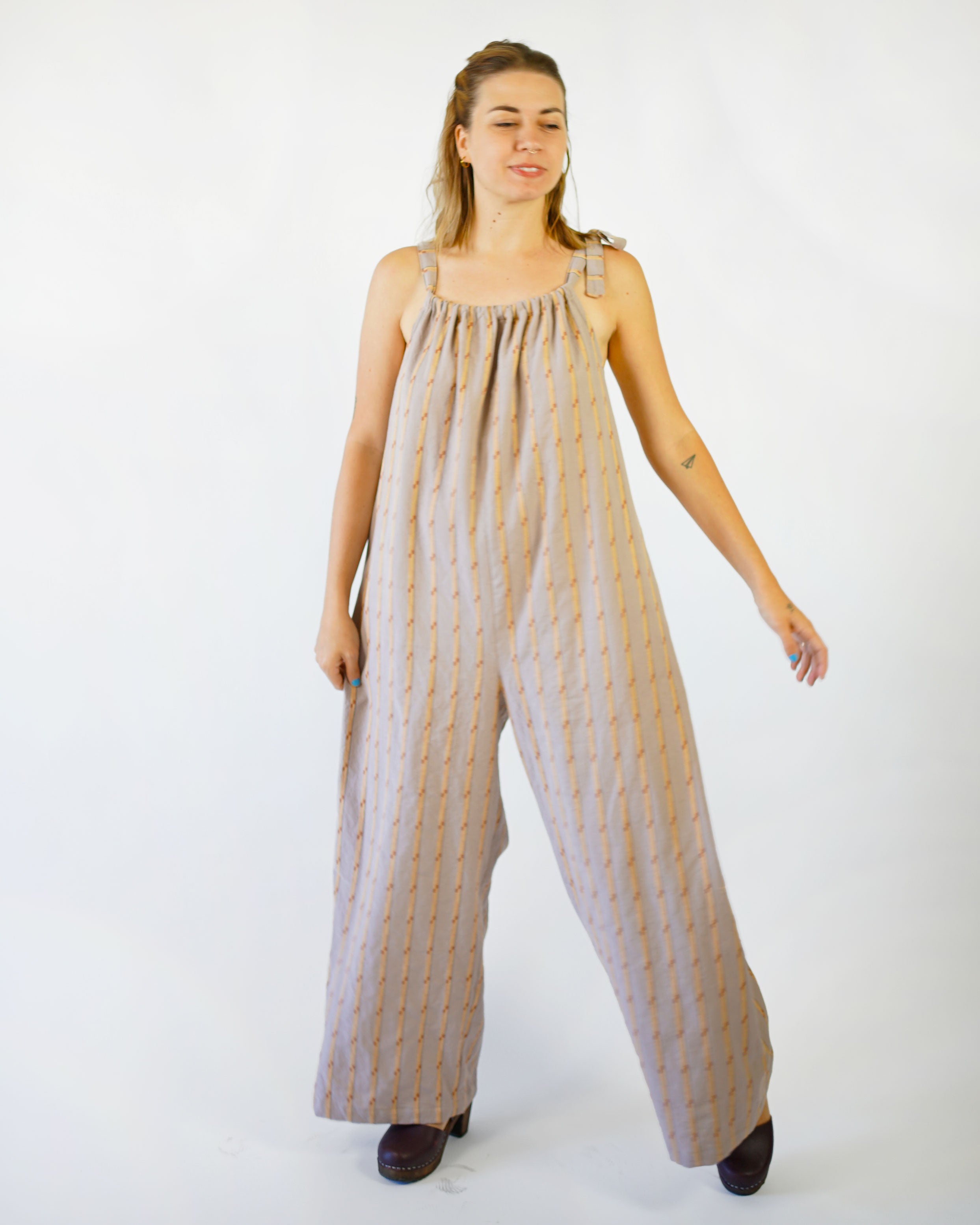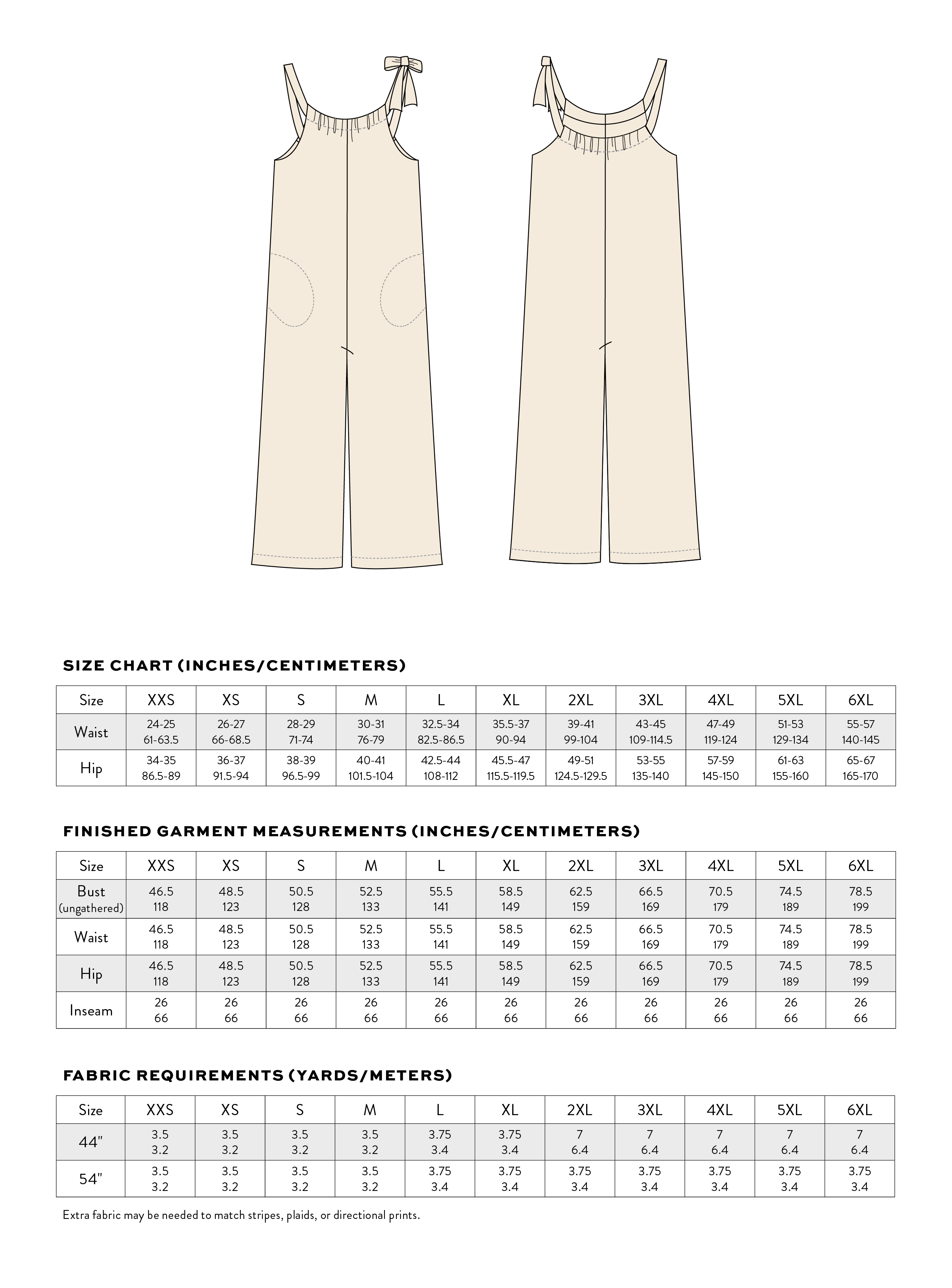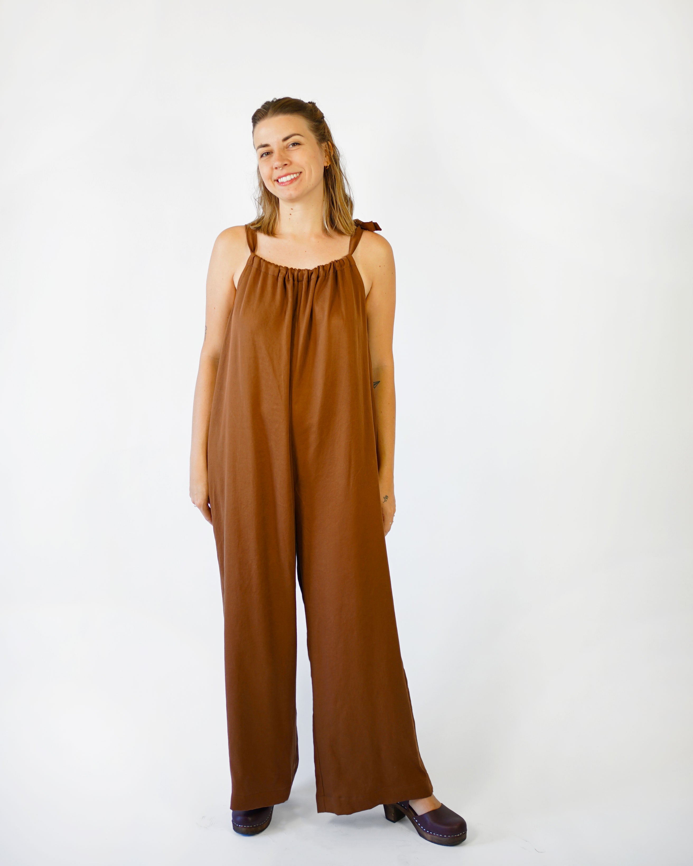 The Cabana Tie Playsuit is an easy to sew, effortless jumpsuit. The fit is slightly oversized and relaxed with wide, voluminous legs and a dropped crotch. It includes inseam pockets and a drawstring style shoulder strap that can be adjusted to your desired length and finished off in a large bow or knot.