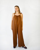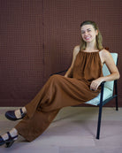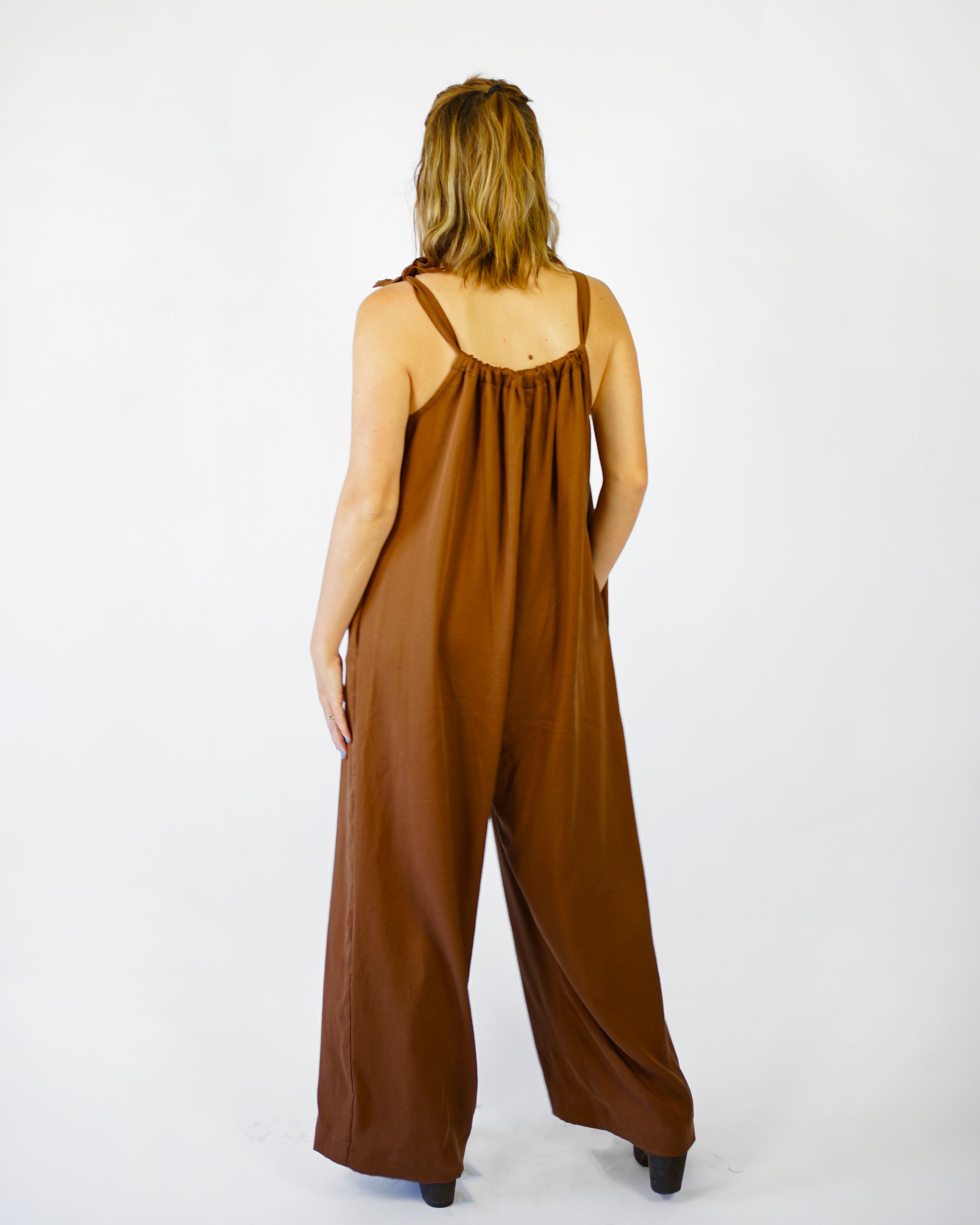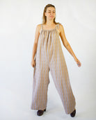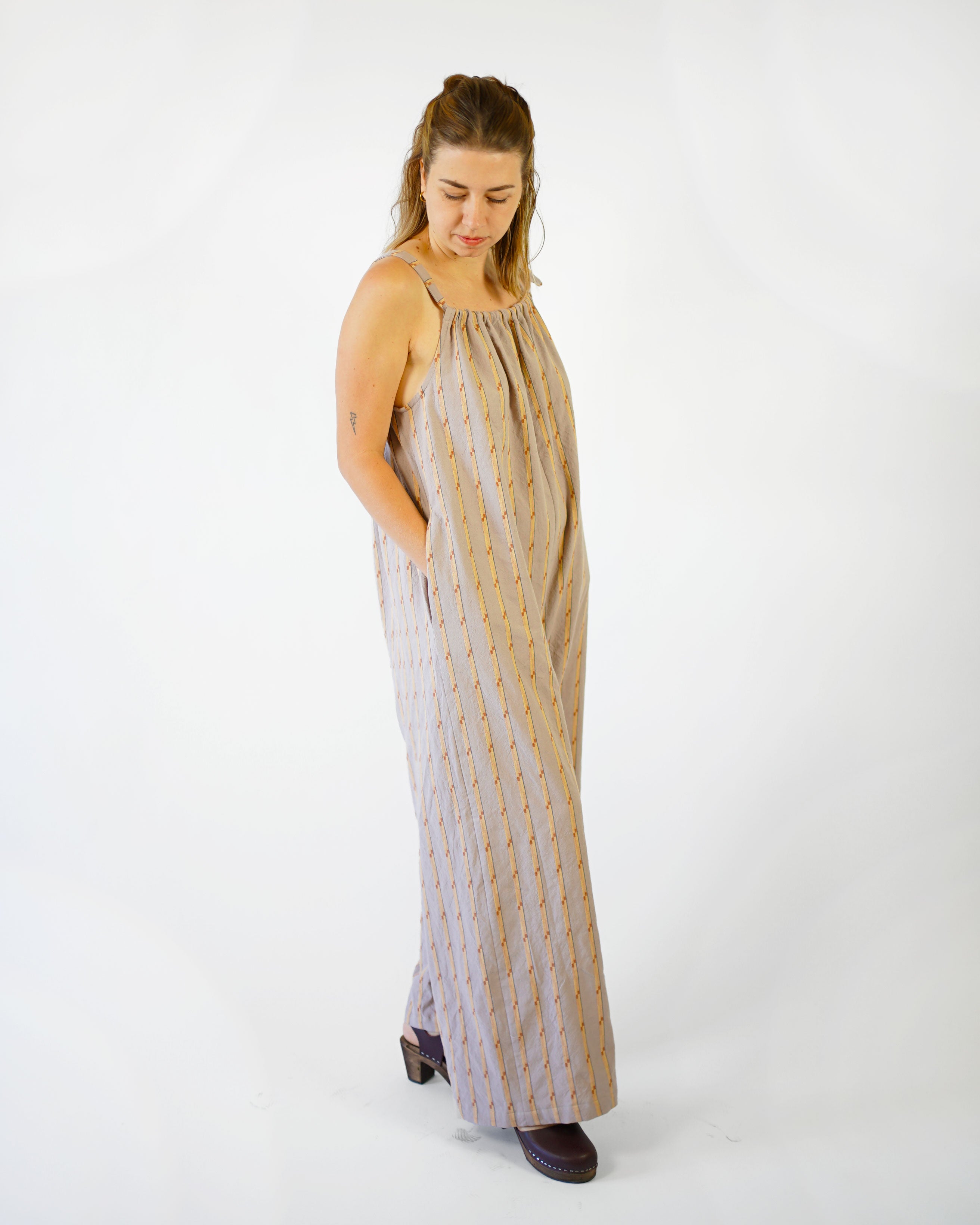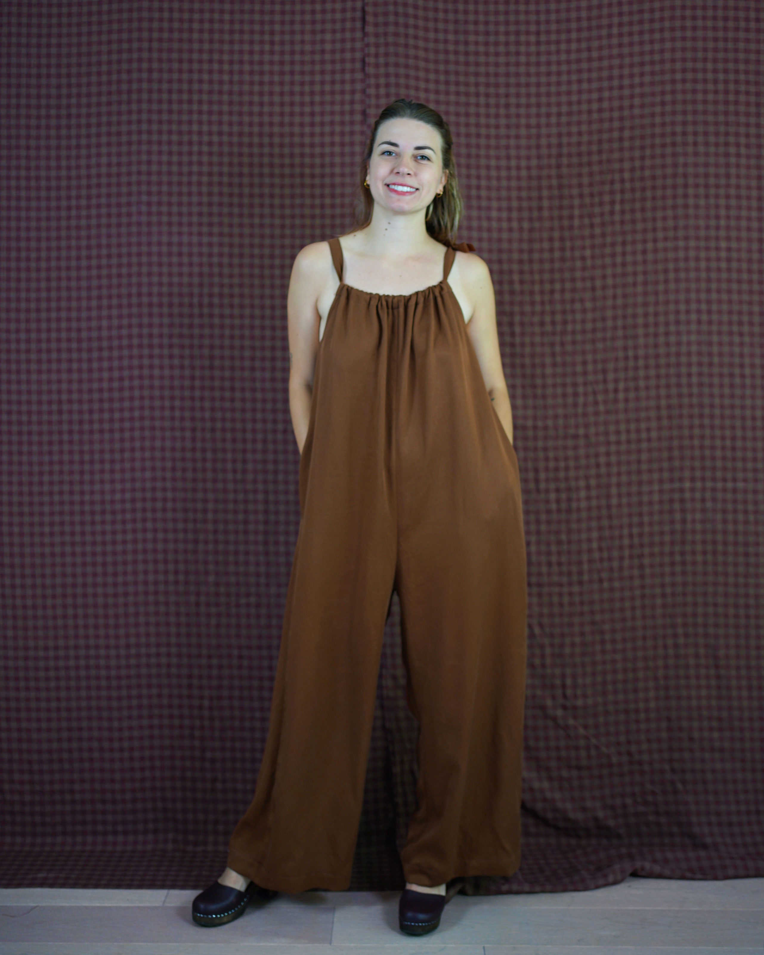 The Cabana Tie Playsuit is an easy to sew, effortless jumpsuit. The fit is slightly oversized and relaxed with wide, voluminous legs and a dropped crotch. It includes inseam pockets and a drawstring style shoulder strap that can be adjusted to your desired length and finished off in a large bow or knot.