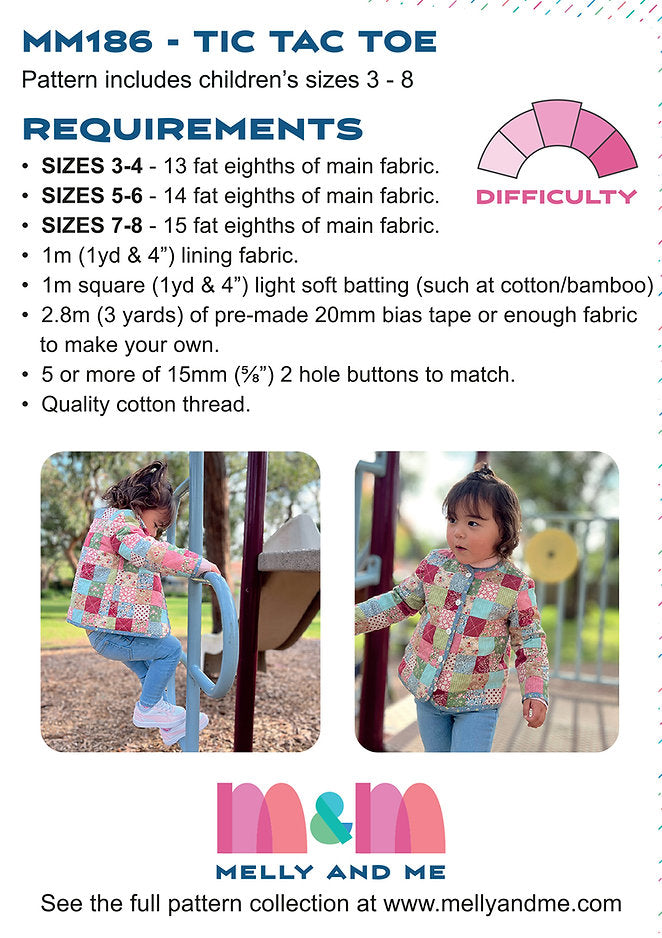 Introducing Tic Tac Toe—a charming patchwork jacket pattern designed with your little ones in mind. Crafted with care and creativity, this jacket is the perfect project for your growing scrap collection or an opportunity to choose coordinating fabrics for a personalised touch. The perfect garment to wrap your cherished little ones in handmade warmth and style This pattern contains full photographic step-by-step instructions and full-sized templates to create your own Tic Tac Toe Jacket.