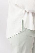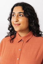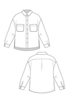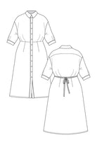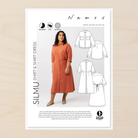Silmu is a stylish sewing pattern duo that includes a loose-fitting shirt and a midi-length shirt dress. Both variations feature a distinctive overlapping collar. The shirt variation also includes breast pockets, a back pleat, long sleeves with cuffs, and an uneven hem with side slits. The waist pleats of the dress variation make it loose at the top, while the skirt is lightly fitted. The dress also has pleated half sleeves and a tie closure at the back.