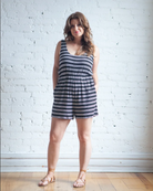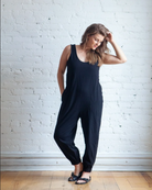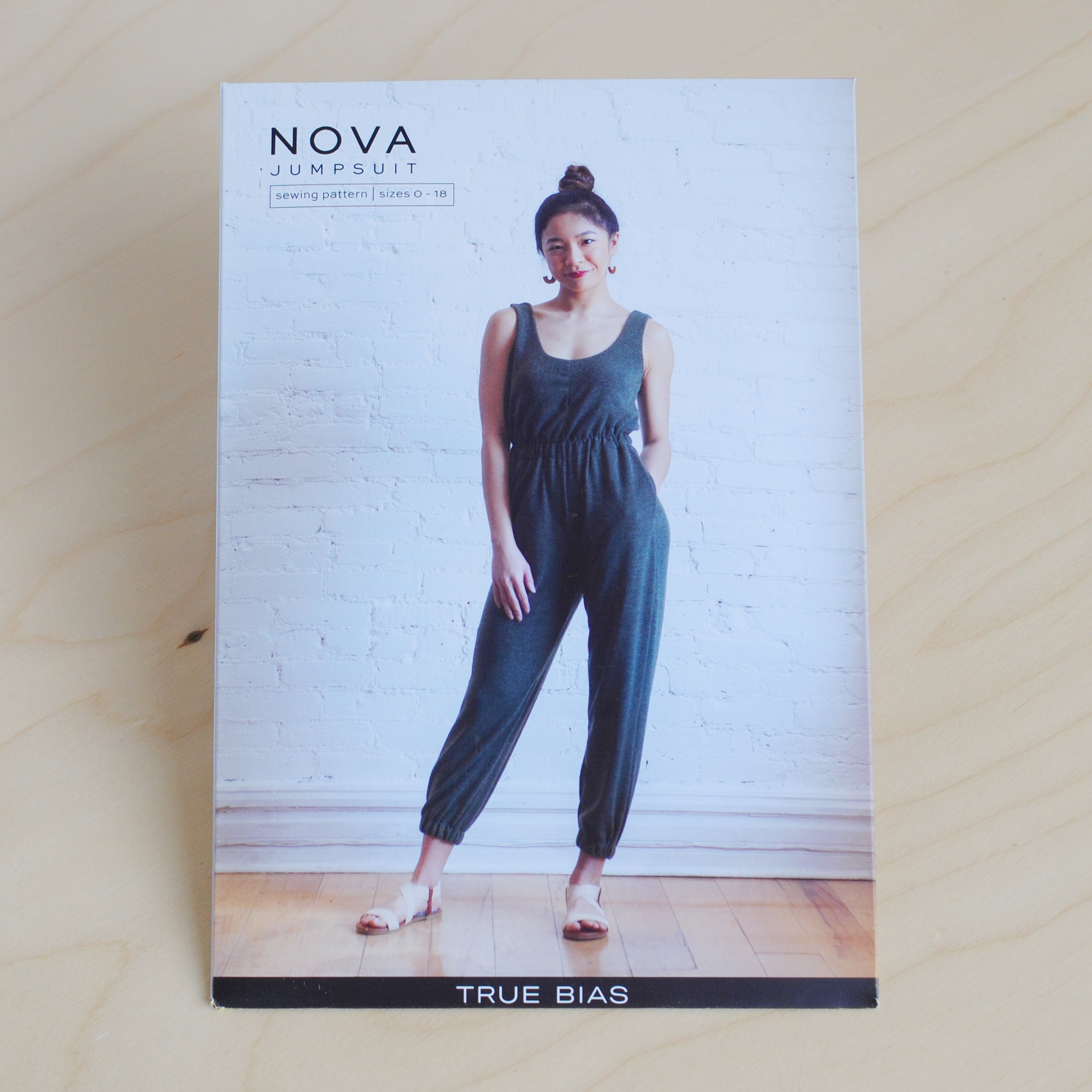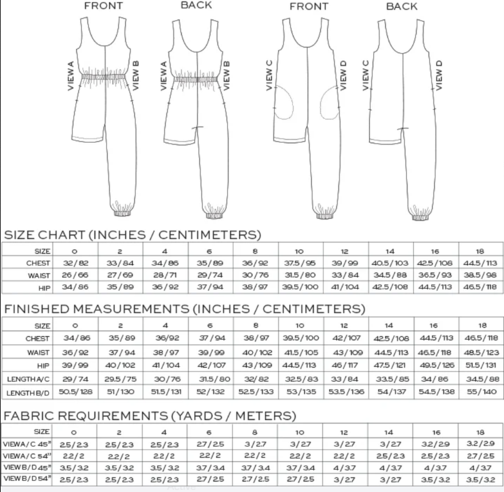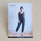 The Nova pattern is a knit jumpsuit with four views. All views have a fully faced neckline and armholes. Views A and B have a wide elastic waistband and inseam pockets. Views C and D have a straight fit through the waist and attached front pockets. Views A and C are a short romper length while Views B and D are long with an elastic casing at the ankle.