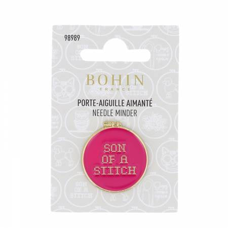 With this needle minder, it’s so easy to keep your needle close to an embroidery or sewing project! Featuring an integrated magnet to fasten to your work, this needleminder is brightly coloured with a cheeky sewing pun on it. Diameter 28mm / 1’’