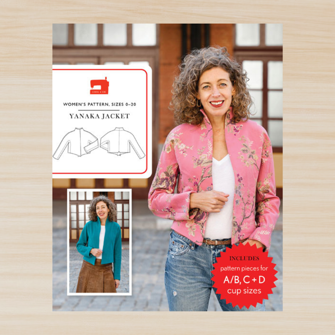 A cross between a blazer and a cardigan, this chic, unlined jacket is semifitted, slightly cropped, and includes several unique features: a cutaway silhouette, cut-on sleeves, a sleeve gusset for better movement and fit, and a gentle stand-up collar. With no set-in sleeve and no closures, this style is fun and easy to sew as well as versatile to wear. The cut-out V-notch at the back hem adds a little extra style, and the pattern is great for color blocking. This style includes cup sizes with added bust darts for C and D cups to help you get a perfect fit.
